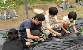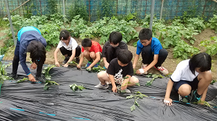 5月16日(金)、全校でサツマイモの苗を植えました。秋にたくさん収穫し、おいしい焼き芋が食べられるように、順調に育ってほしいです。
