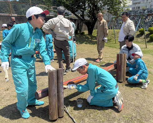 1回目の今回は、体育館で尾鷲市の林業の概要や尾鷲ヒノキの育て方や流通過程等についての説明を聞いた後、3年前の尾鷲育で作った尾鷲ヒノキを使った丸太渡り橋の修復作業を行いました。
