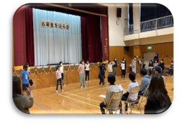 2月3日(金)になわとび大会を行いました。12月から学級や縦割り班で練習してきた成果を発表する場です。個人種目では「1分間で何回とべるかチャレンジ」「得意技発表」を,縦割り班では「8の字とび」を行いました。