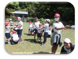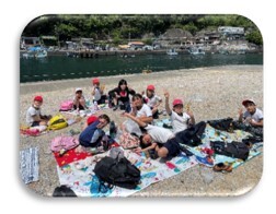 まずは長い階段で有名だった旧梶賀小学校です。みんな一生懸命上り,グラウンドに着いたらすぐに1年生を迎える会を行いました。6年生が初めて仕切る行事です。みんな楽しそうに遊んでいました。昼ご飯は堤防近くの広場で食べました。帰りには出来立ての「梶賀のあぶり」を御馳走になりました。梶賀の人たちも多くの子どもたちが来たことを喜んでくれました。