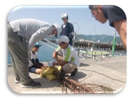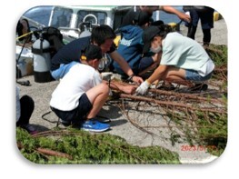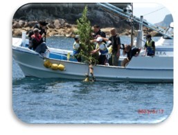 5月17日に,5・6年生がアオリイカ産卵床を尾鷲ヒノキの間伐材で作りました。市水産農林課の職員から説明と指導を受けた児童は,約3メーロルの間伐材で産卵床を作り,3隻の漁船に乗り込んで三木浦漁港に沖に投入しました。子どもたちは,間伐材の有効利用や自然環境の大切さを理解しました。