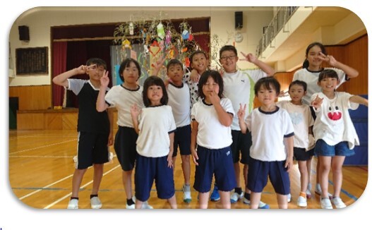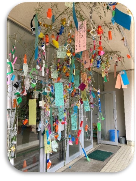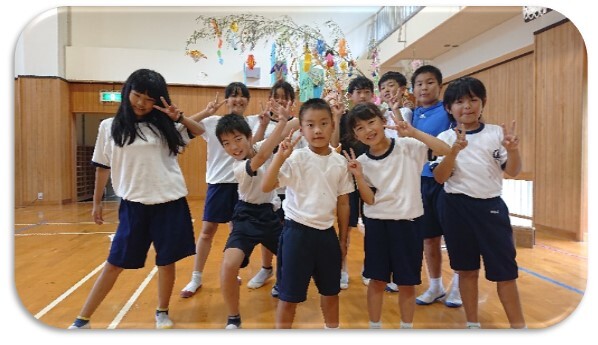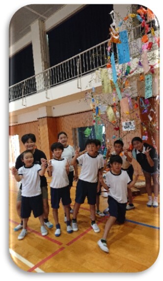 7月7日に児童会主催の七夕集会が行われました。全校児童が体育館に集まり,「たなばたさま」を歌ったり,織姫と彦星の紙芝居,七夕に関する書籍紹介を聞いた後,縦割り班で3本の笹飾りと作りました。児童玄関の前に飾りました。