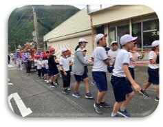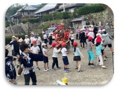 4年振りに各町内で祭りが行われています。賀田の山王神社祭礼も7日行われ,子どもたちは神輿を引っ張り,「尾鷲節」「輪内音頭」を元気に踊り,中学校の「エイサー」を見て餅まきにも参加しました。