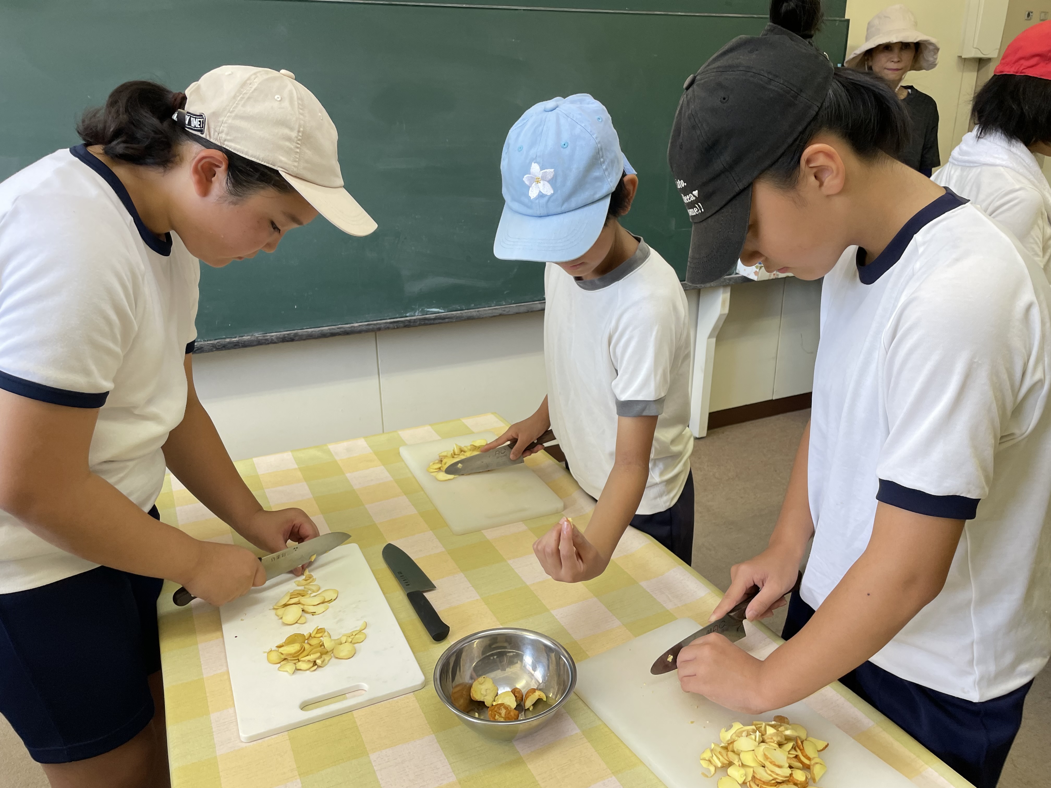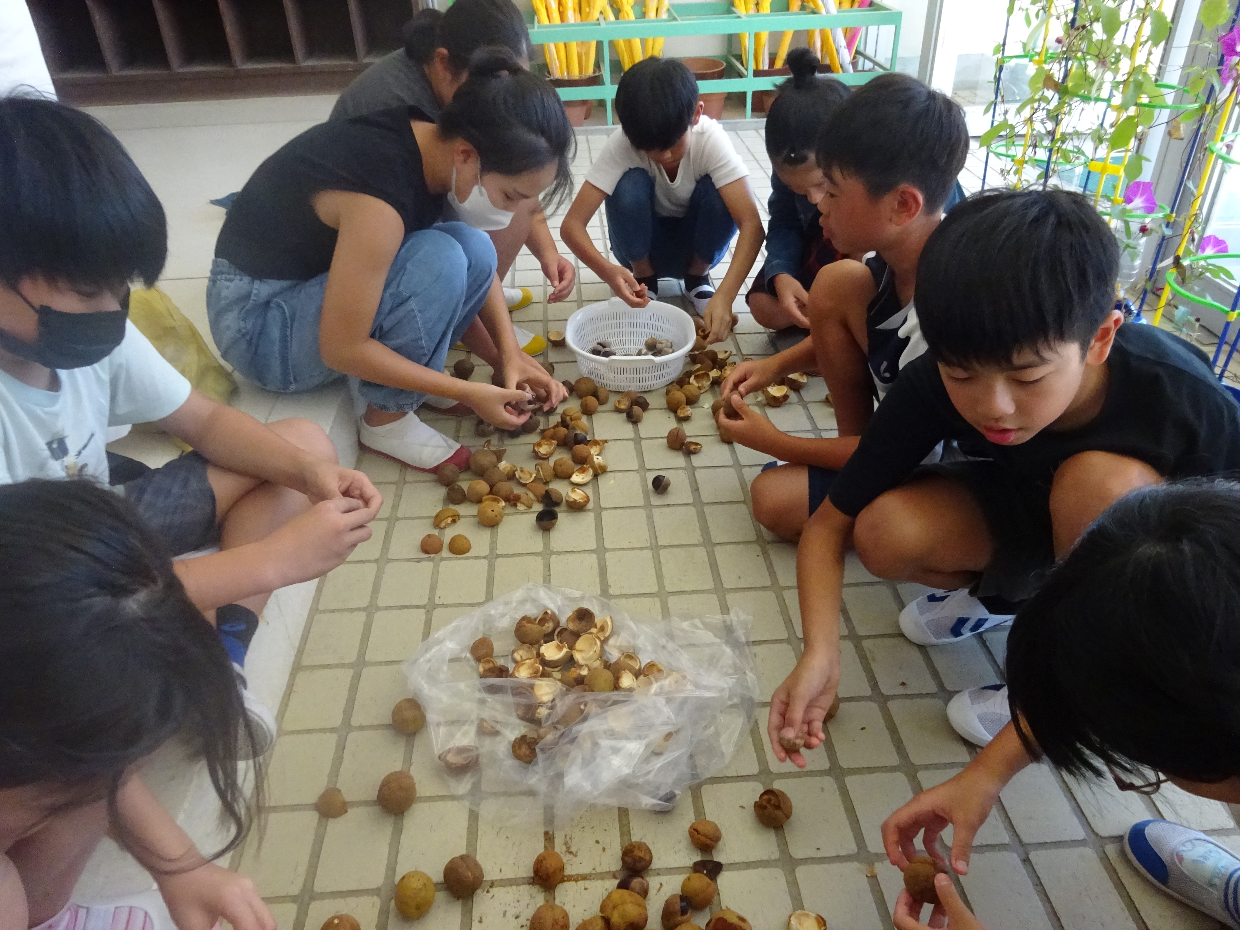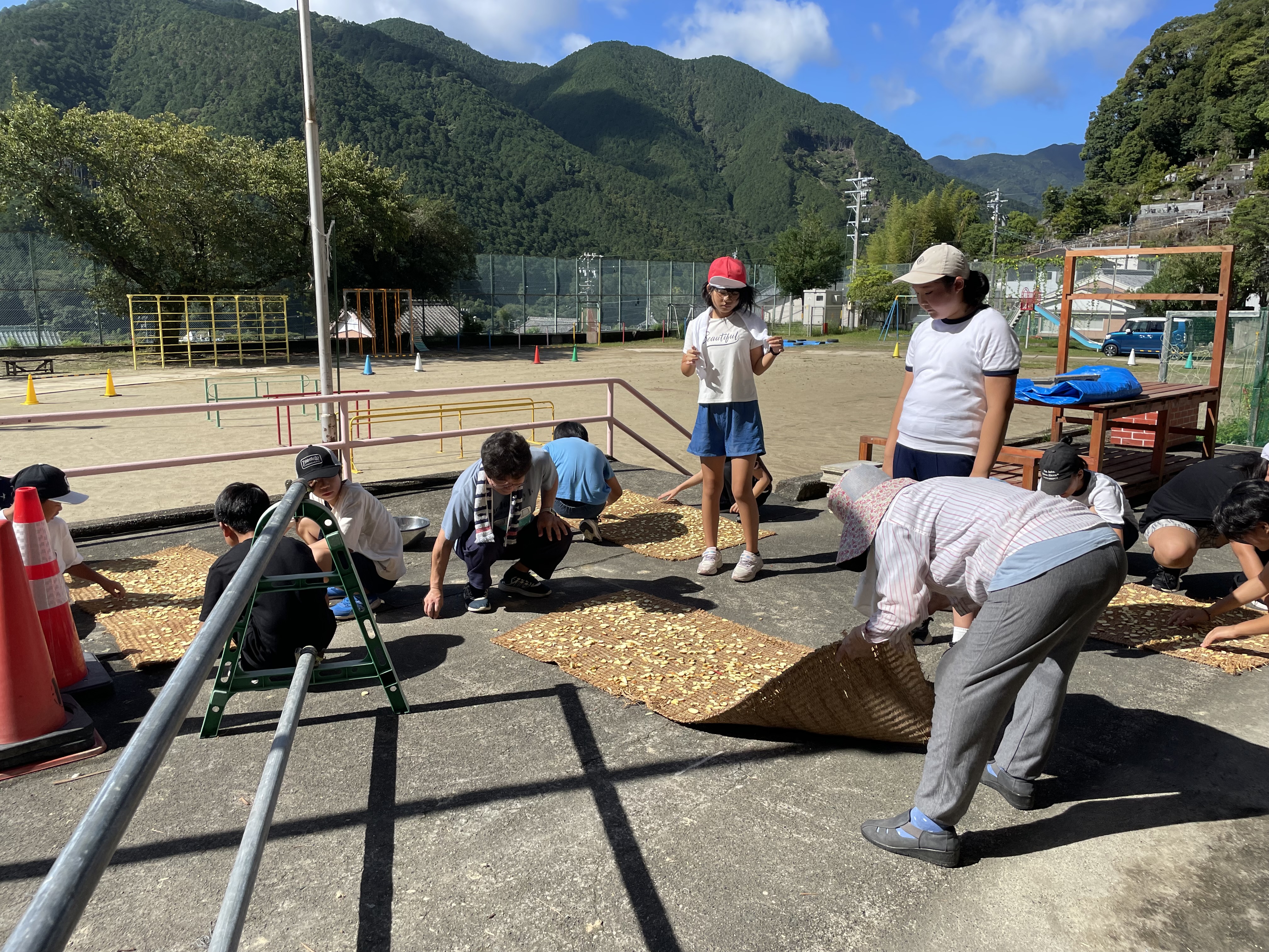 9月11日(水)、5・6年生がトチの実の皮むきとスライス・天日干しを行いました。本来ですと5月にトチの花を見た北山へ実を拾いに行くのですが、尾鷲市においても熊の目撃が多く、安全を考え今回は見送りました。ただ、賀田区の方々が、「子どもたちのトチの実学習のために」と何度か北山まで出向き、トチの実を拾って届けてくださいました。また、作業についても、いつもお世話にっている地域の方に教えていただきながら行いました。賀田小学校を応援していただけるみなさまのおかげで、途切れることなく学習を続けることができました。