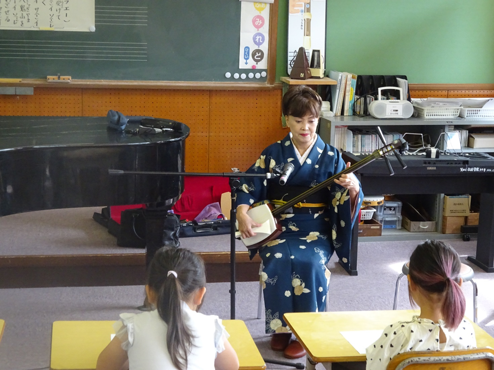 10月25日(金)、第22回尾鷲節コンクール優勝の渡辺二三子さんに、尾鷲節の歌い方を教えていただきました。渡辺さんが三味線を片手に尾鷲節を歌い始めると、子どもたちは「かっこいい」「すごい」と言いながら、生歌に引き込まれていきました。踊る機会はあっても、尾鷲節を歌うという機会はなかなかありませんので、独特な歌い方に最初はとまどっていましたが、こつをつかむと少しずつ歌えるようになっていました。授業の最後には、三味線と太鼓に合わせて全員で尾鷲節を歌いました。ふるさとの伝統文化に触れるよい学習となりました。