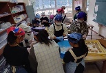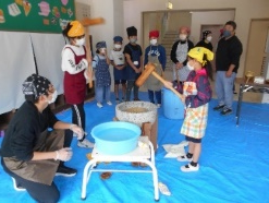 12月13日(金)もちつき大会を行いました。それに先立ち、9日(月)からあく抜き作業を始めました。いつもお世話になっている小川さんの指導のもと、灰を穴の開いた缶に入れ、熱湯をかけて灰汁をとります。一番搾りは保管して、9月に乾燥させたトチの実を二番搾りへつけて一日目の作業は終わりました。10日(火)の夕方から11日(水)の朝まで、流水にさらしました。11日(水)は、月曜日の灰汁一番搾りを沸かし、それにトチの実をつけました。あとはもちつき大会の金曜日まで置いておきます。12日(木)、5・6年生が会場づくり、お米研ぎ、餡まるめなどの準備をしてくれました。13日(金)、5年振りに全校でのもちつき大会です。4つの縦割り班に分かれて一臼ずつつきました。初めてのもちつきという子が多かったですが、リズムを合わせて杵を振り下ろしていました。つき終わった後は、それぞれ自分の分を丁寧に丸めていました。一つずつ食べましたが、「おいしかった」と満足した顔を見ることができました。