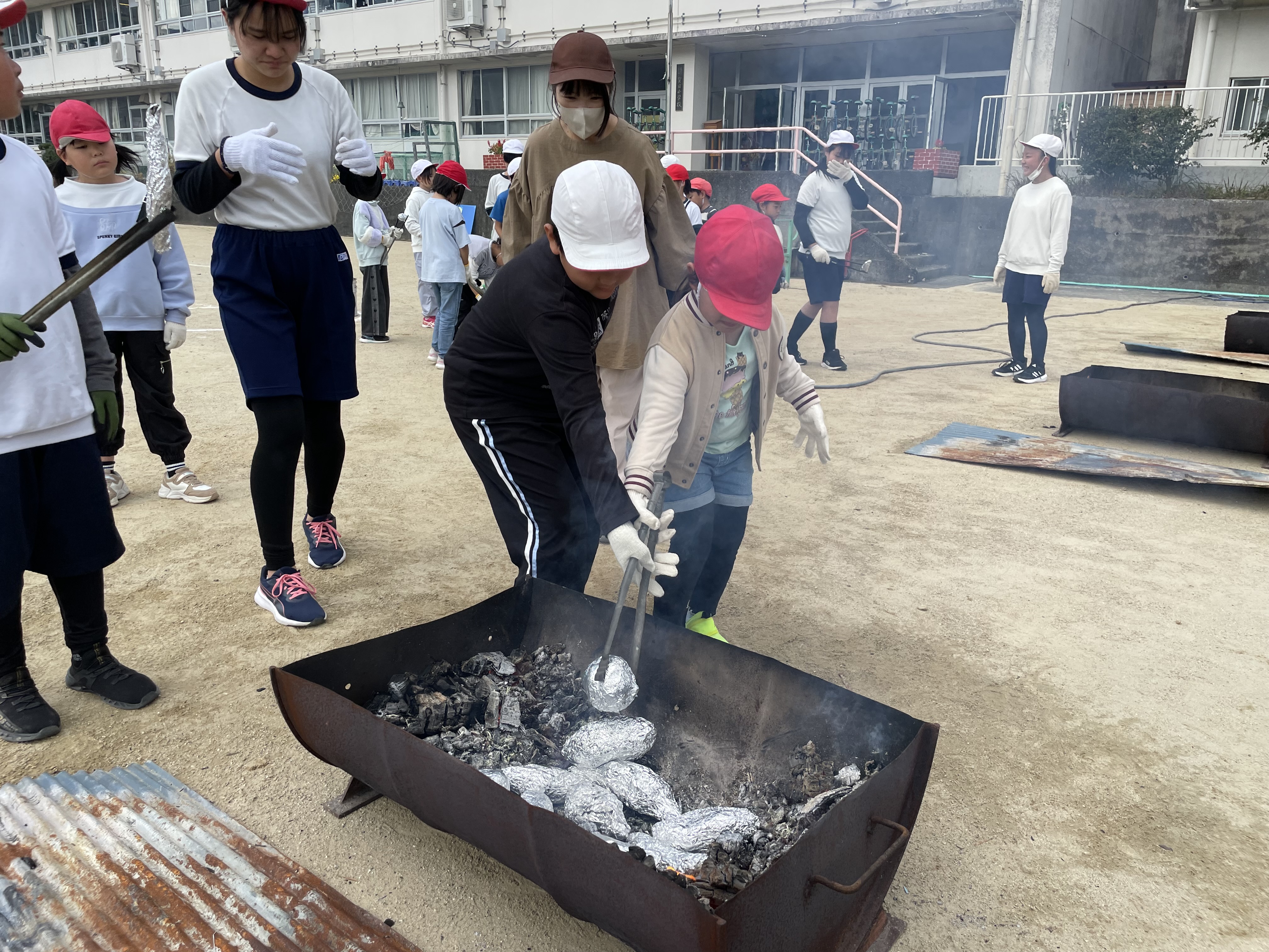 12月3日(火)やきいも大会を行いました。この日は、午前中にいもを新聞でくるみ、その上からアルミフォイルで巻く作業を行いました。給食後、ドラム缶にいもを入れましたが、少し緊張気味の子は、班のメンバーの助けを借りながら無事にやり遂げることができました。焼きあがるのを待っている間は恒例の「石けり」をしました。15分休みや昼休みに一輪車と交互に練習してきましたが、低学年の子たちも高学年に負けないくらい頑張っていました。焼きあがったいもは、とてもいい色をしていて、甘くておいしかったです。
