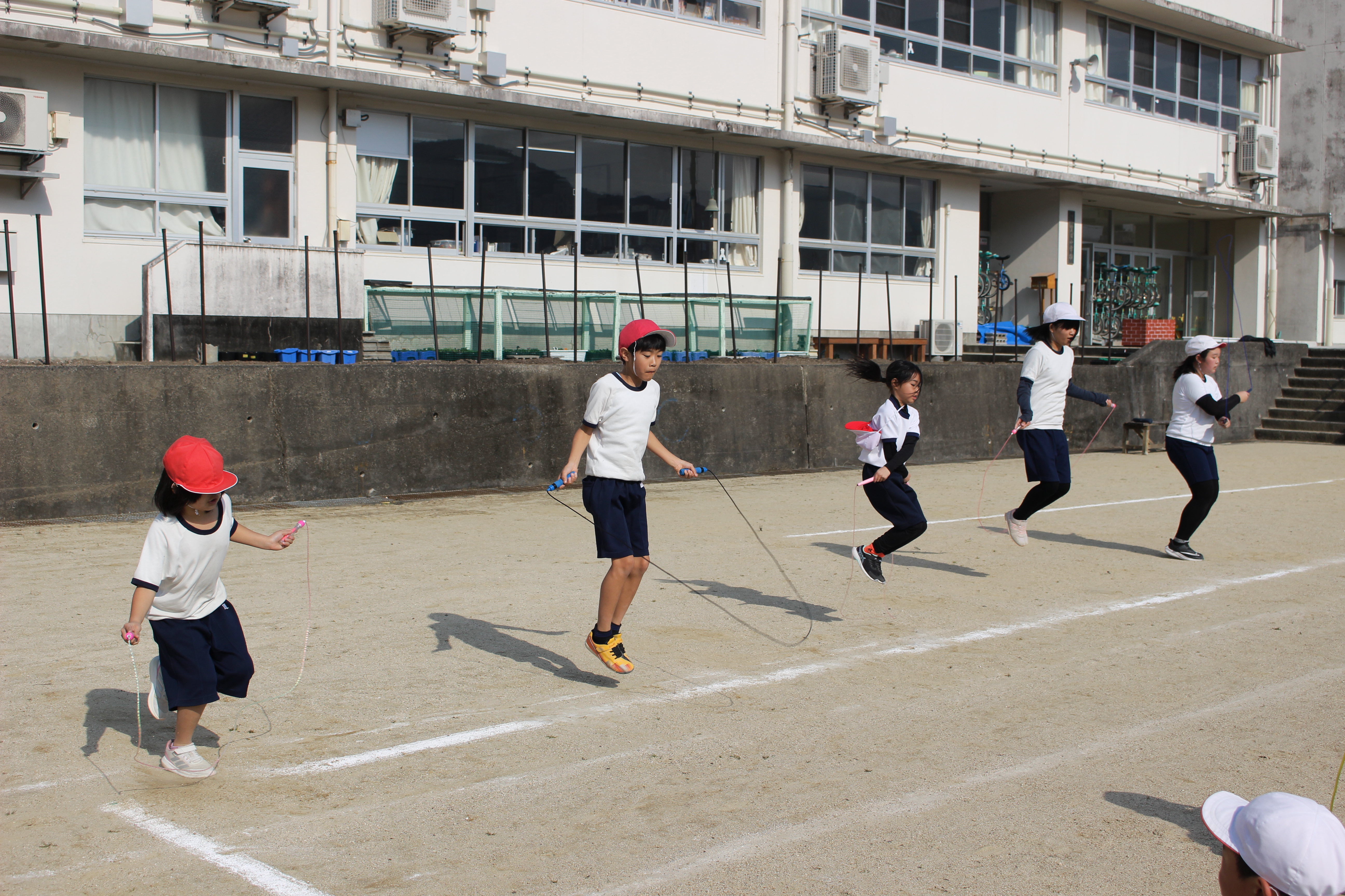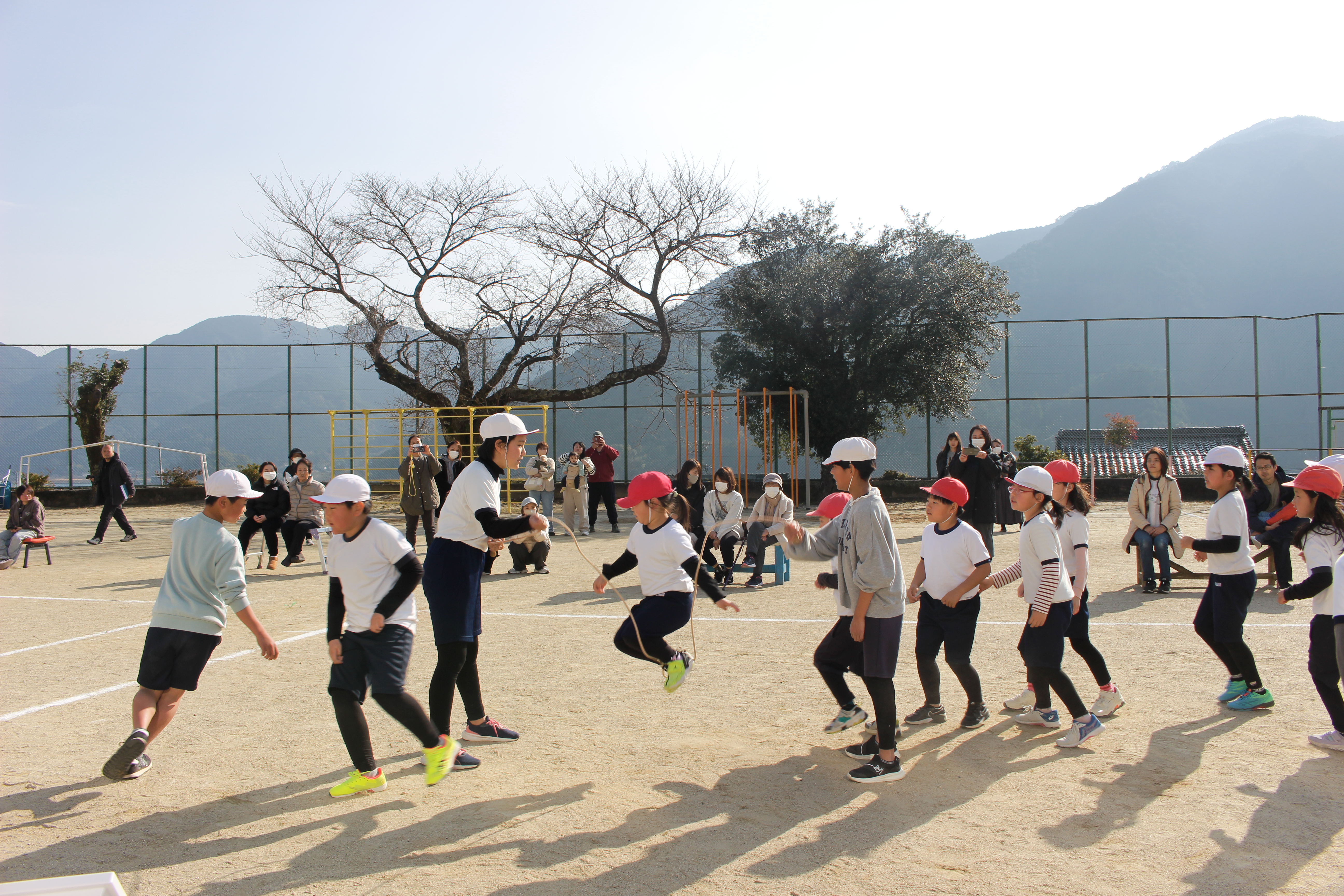1月24日(金)12月から個人技や8の字跳びの練習を続けてきた成果を発表する、なわとび集会を行いました。練習開始のころと比べると、個人技では跳び方が上手くなり、また、跳ぶ回数も多くなり、一人ひとりの成長の跡が見られました。8の字跳びも、最初は引っかかることが多く中々続きませんでしたが、高学年を中心に、なわの回し方の工夫や跳ぶ順番を試行錯誤しながら練習を続け、なわに入っていくのに苦労していた子たちも、コツをつかんでとてもスムーズになっていました。