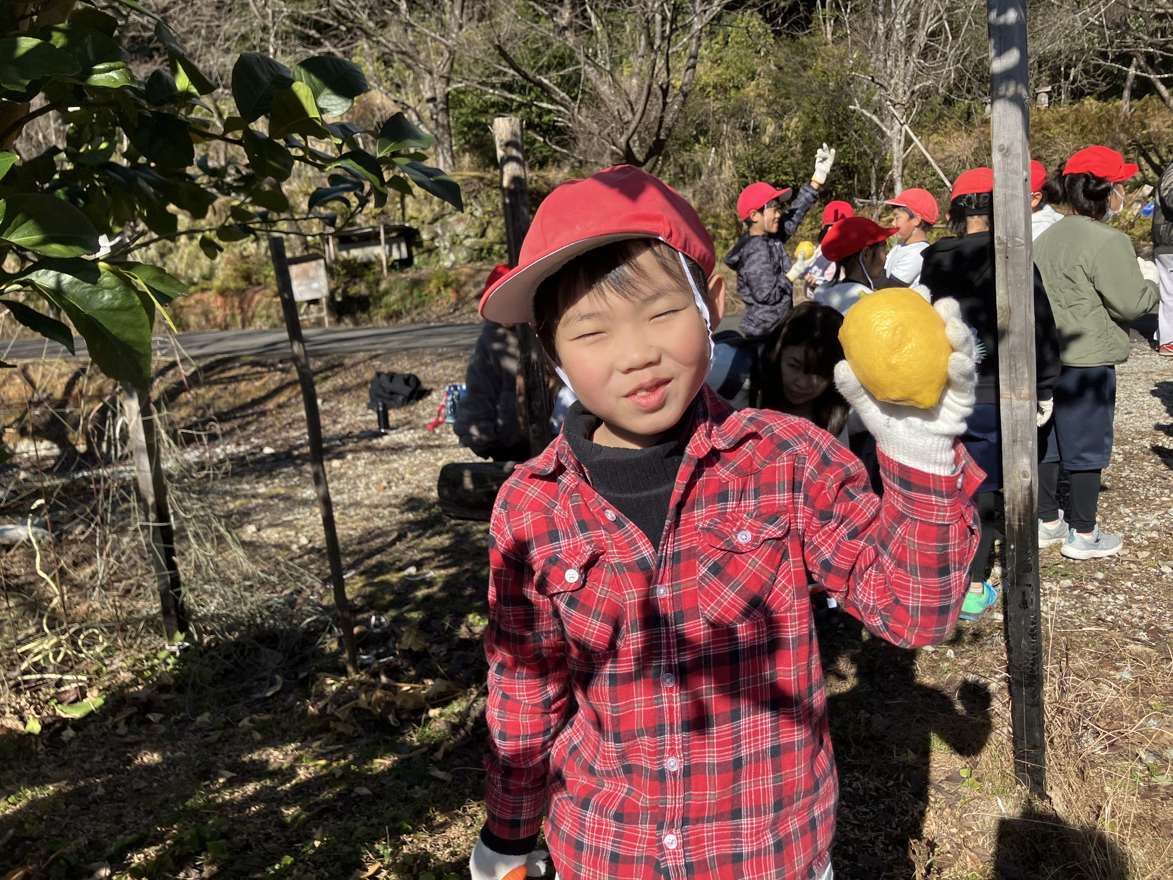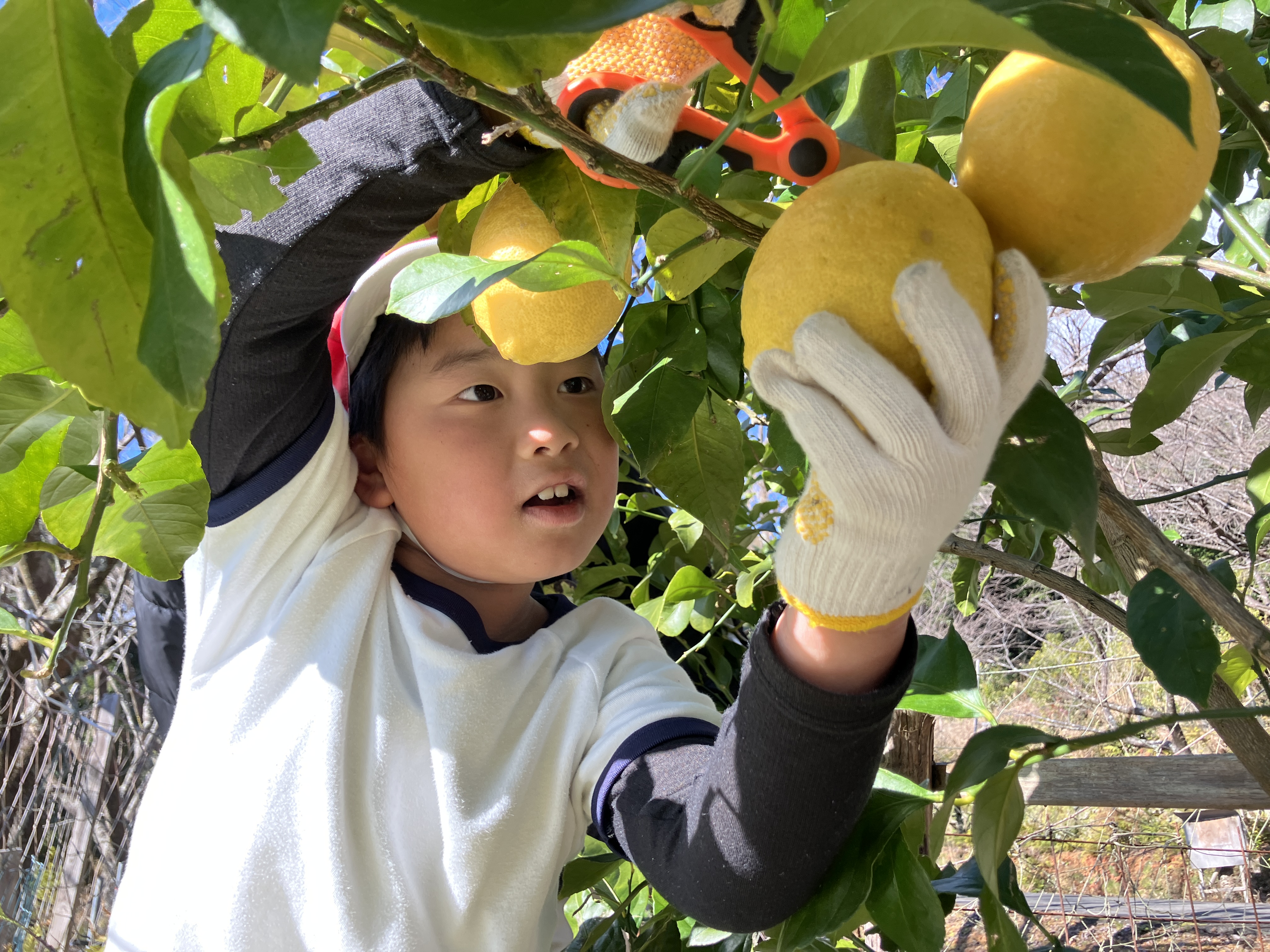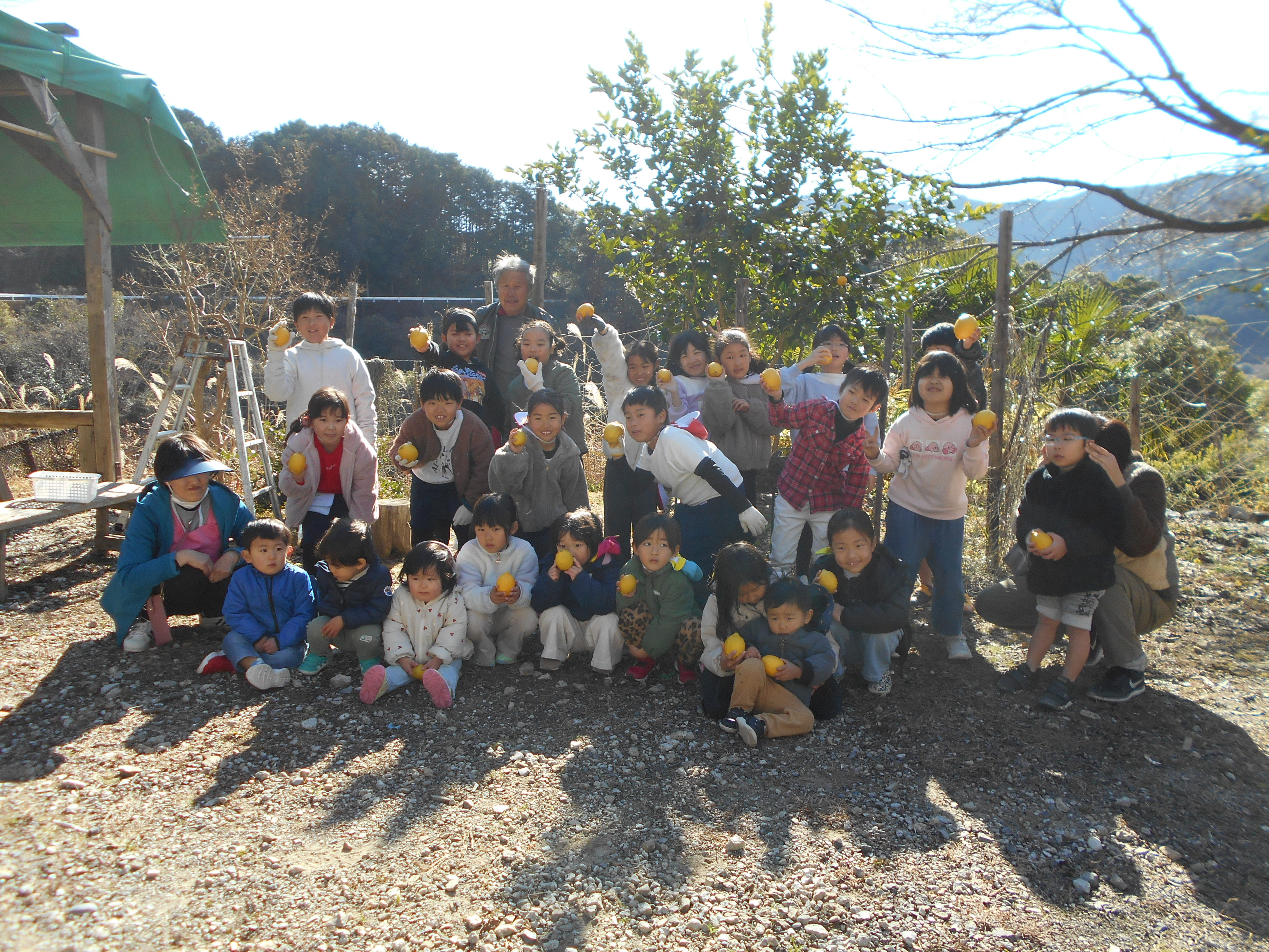 1月29日(水)1・2・3年生がレモンの収穫を行いました。この木は現3年生が南輪内保育園卒園記念で植樹したものです。一人ひとり,大きく実ったレモンをていねいにはさみで切りました。この日は保育園児も一緒に収穫を喜びました。
