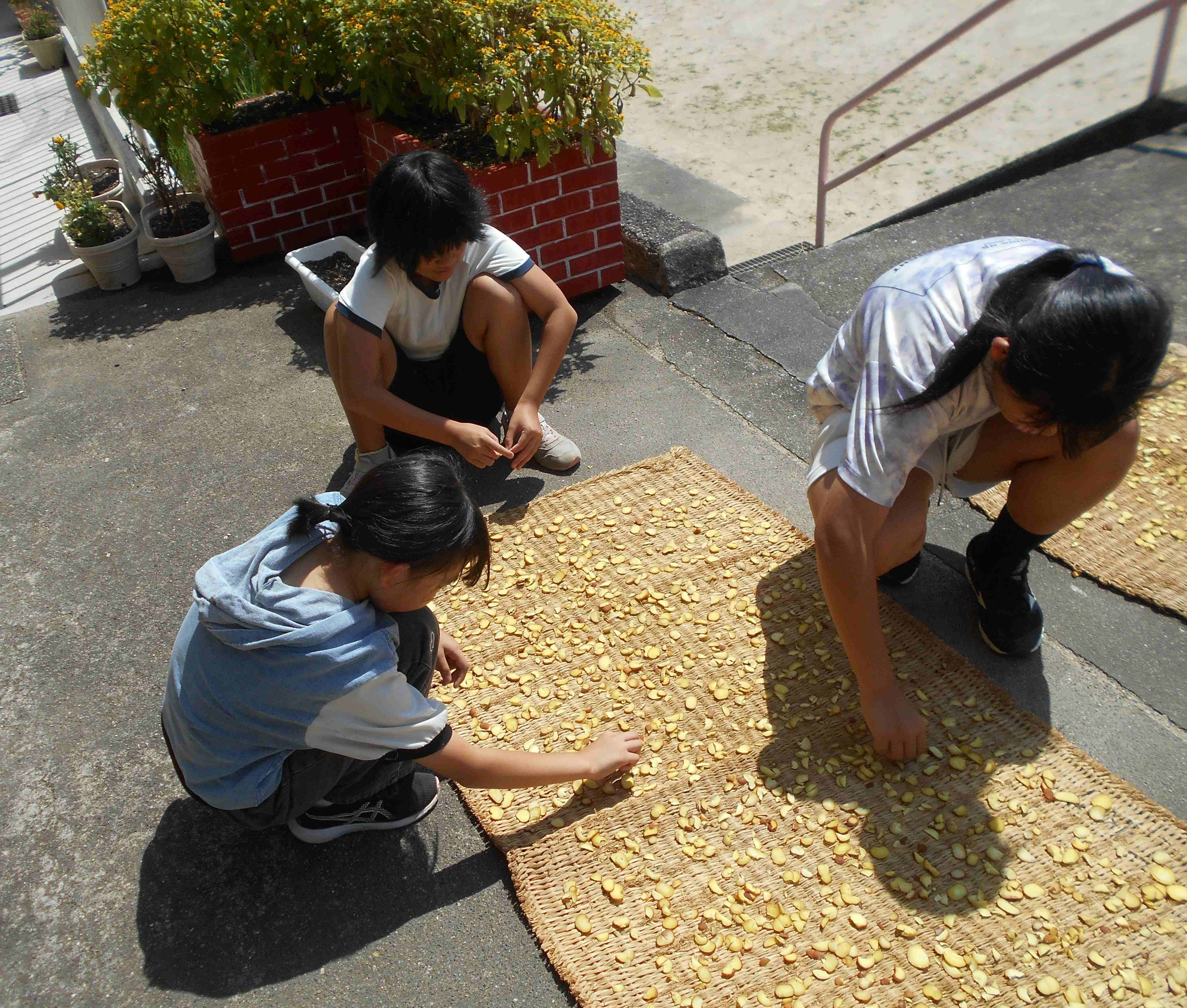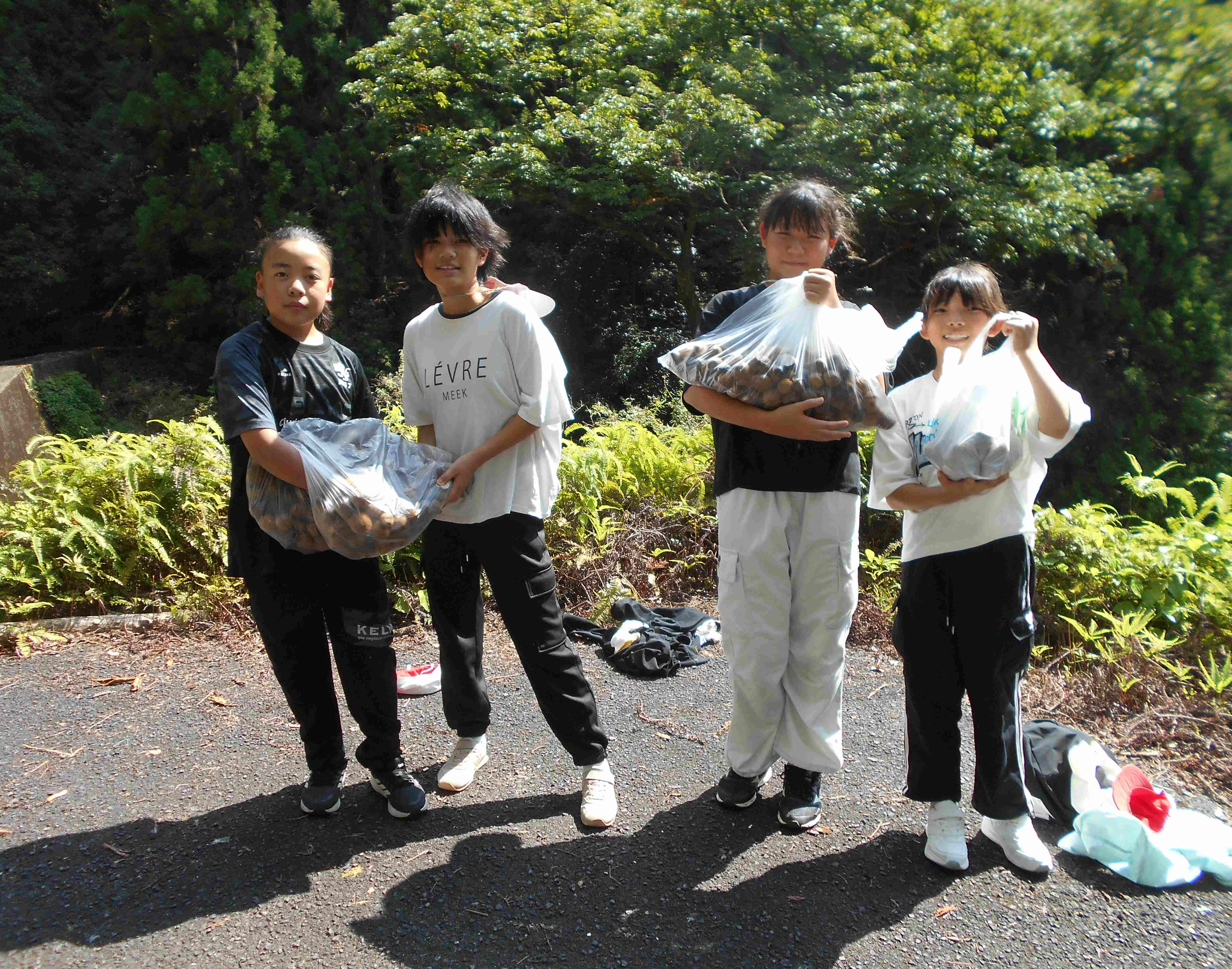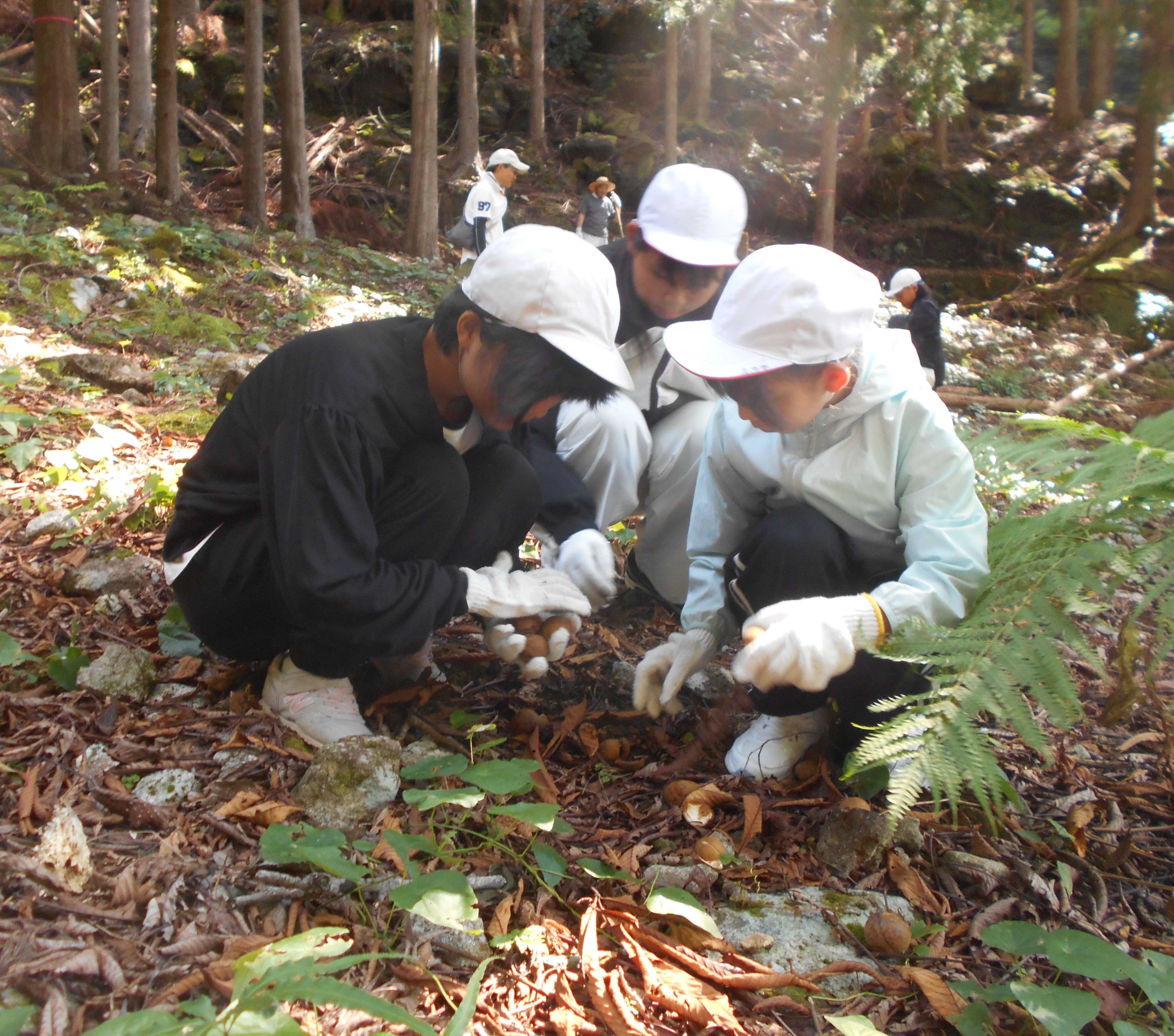 6年生が北山へトチの実拾いに行ってきました。大トチの木の周りにはたくさんの実が落ちていて、30分ほどの間に400個ほど拾うことができました。翌10日(水)には、前日から水につけていたトチをお湯に浸し、皮をむいてスライスして、その後天日干しをしました。