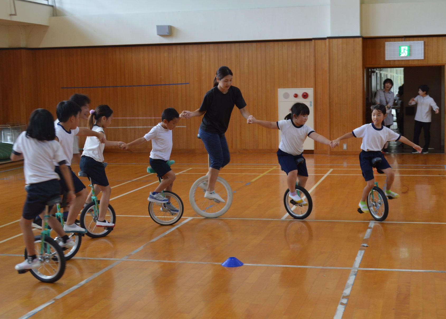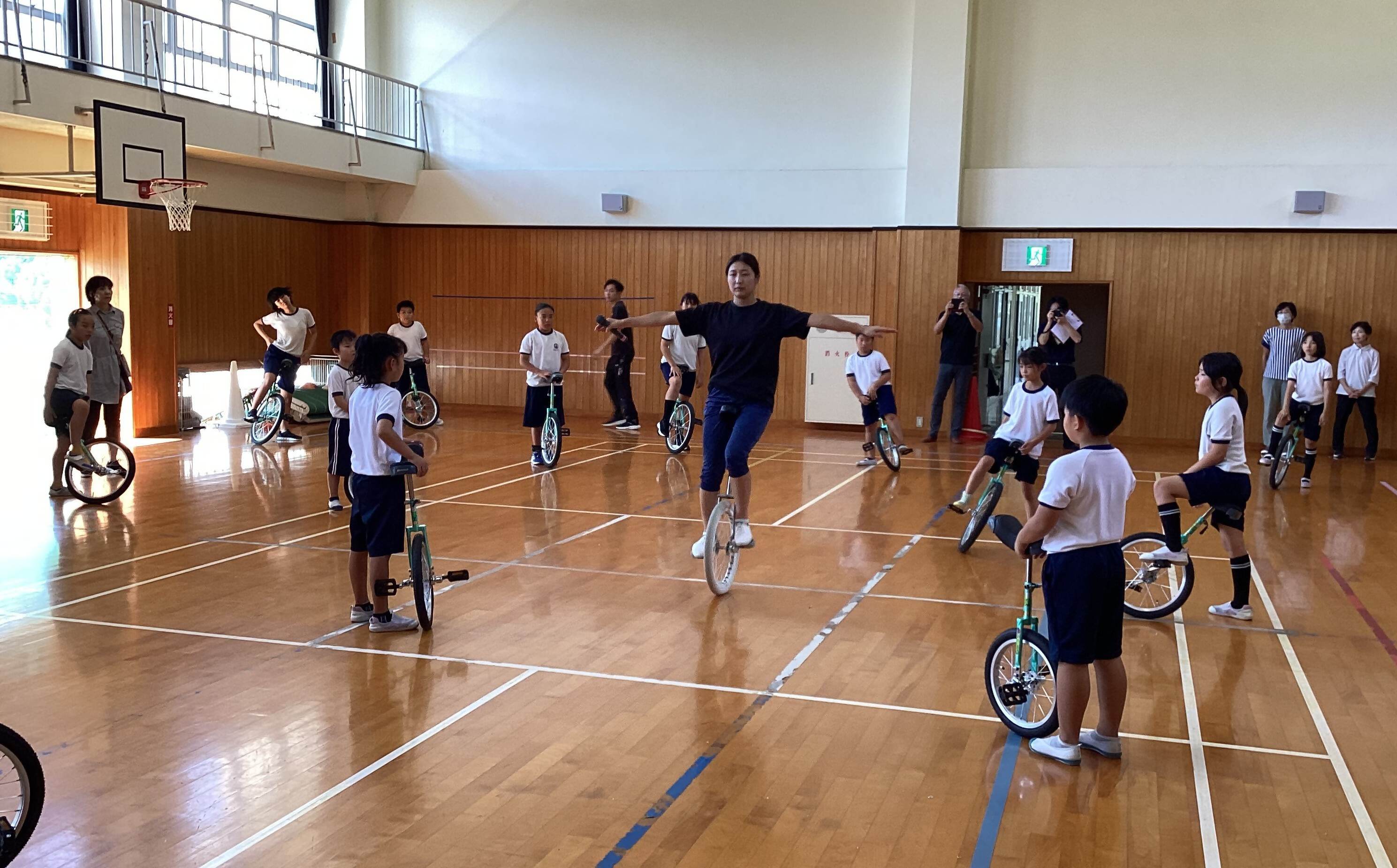 一輪車講習会を行いました。一輪車をいただいた尾鷲ロータリークラブ様より、講習会のプレゼントもいただきました。講師は、6月にもお越しいただいた高田朝日さんでした。今回は、10月11日(土)にロータリークラブの大会で披露する演技を見ていただき、アドバイスをいただくことと、学年に応じた技の練習を行いました。前回同様、基本となるアドバイスをいただくと、別人のように子どもたちの乗り方が変わりました。今回のアドバイスを生かして、尾鷲ロータリークラブ大会に向けて練習を重ねていきます。