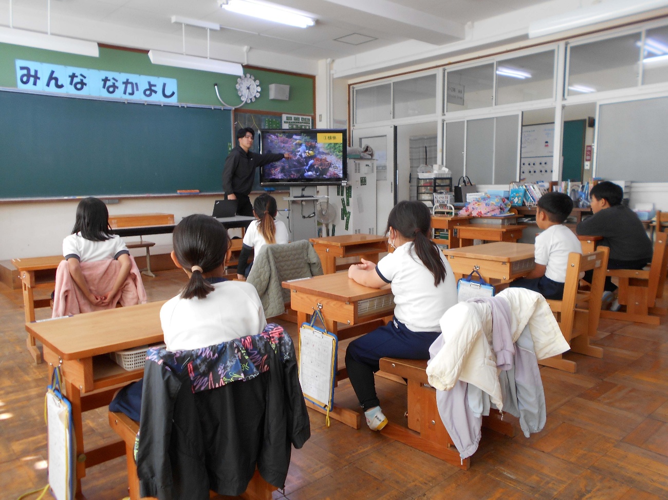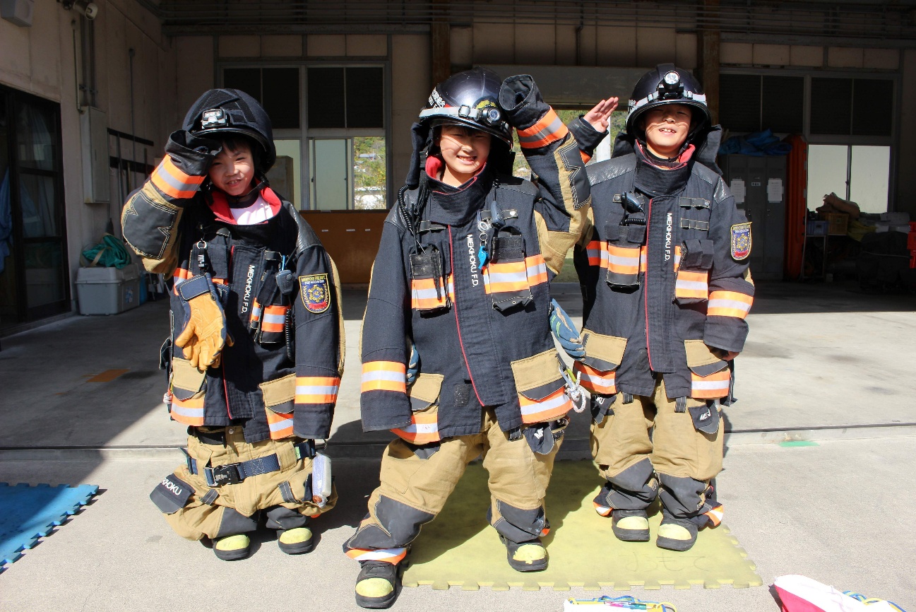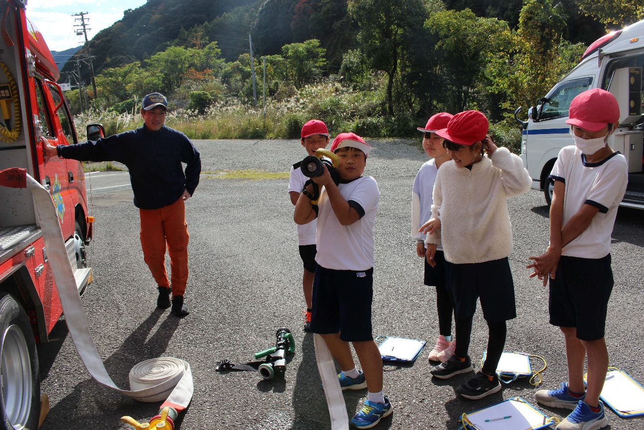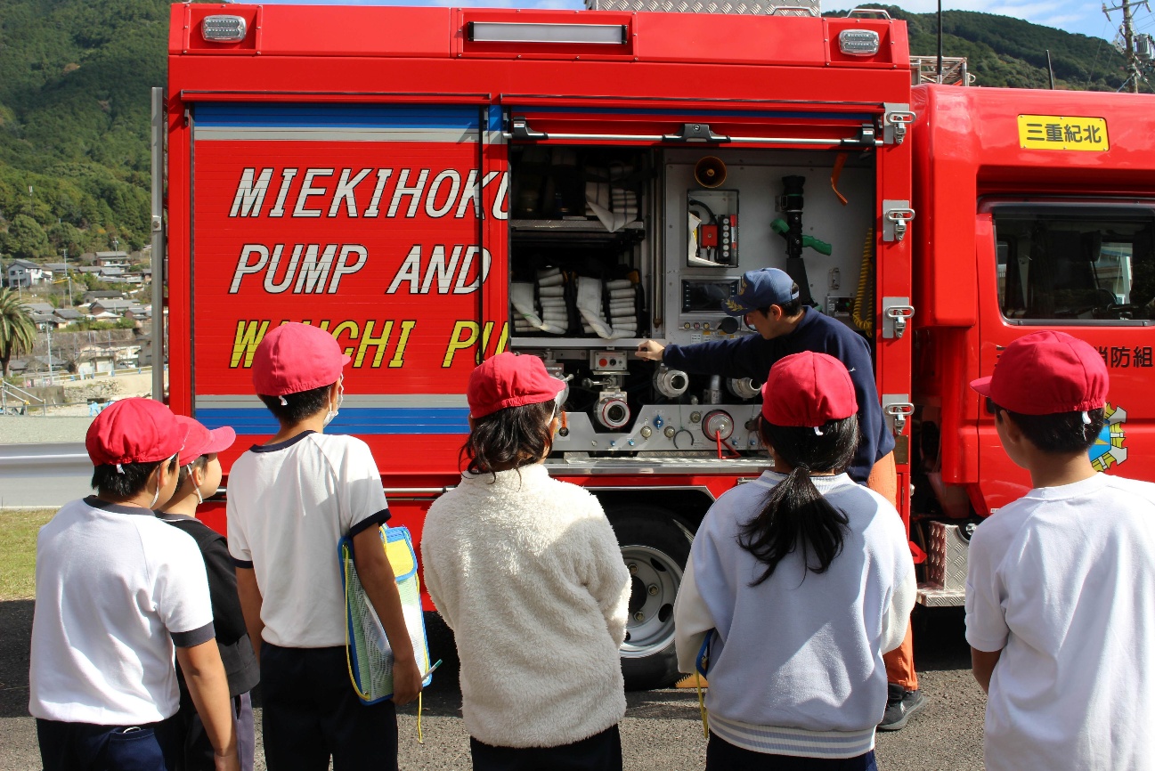 11月20日(木)、3年生が、社会科の勉強で尾鷲消防署輪内出張所を訪れました。消防自動車や通信の設備、日常的な仕事や万一に備えた訓練など、市民の安全な暮らしを守る消防署員の仕事について理解を深めました。なんとこの日は、出動の際に消防服を装着する様子も見せていただくことができ、その速さに子どもたちは驚いていました。