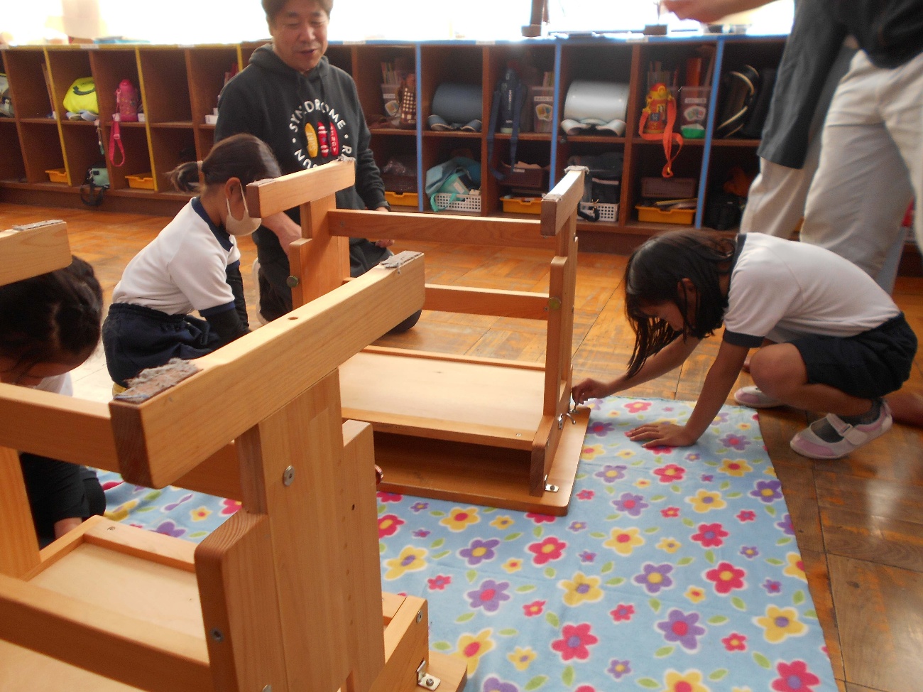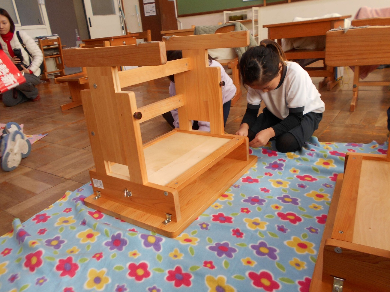 11月27日(木)、1年生が教室で使っている机の天板を交換しました。「みえ森と緑の県民税」の市町交付金を活用し、尾鷲市が「木とふれあう学校環境づくり事業」として実施しているものです。1年生は、昨年経験した2年生の応援を受け、六角レンチでネジを外し、新しい天板を乗せて、ネジをつけて完成させました。新しい天板が嬉しくて、頬ずりしている子もいました。卒業まで大切に使います。
