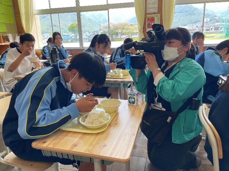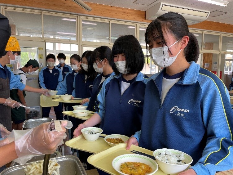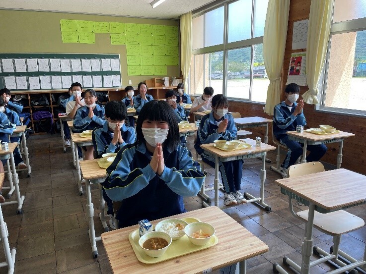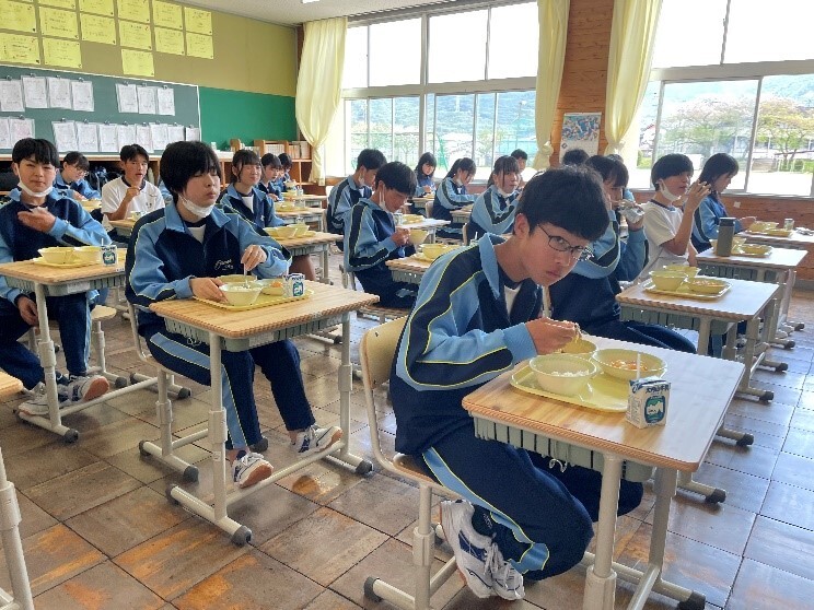 4月10日(月)、いよいよ尾鷲中での給食がスタートしました。初日のメニューは、カレーとフルーツヨーグルト。1年生は3月まで小学校で給食を食べていましたが、2・3年生にとっては久しぶりだったので、準備に少し手間取っていました。それでも、「いただきます」をした後は、みんなおいしそうに給食を食べていました。