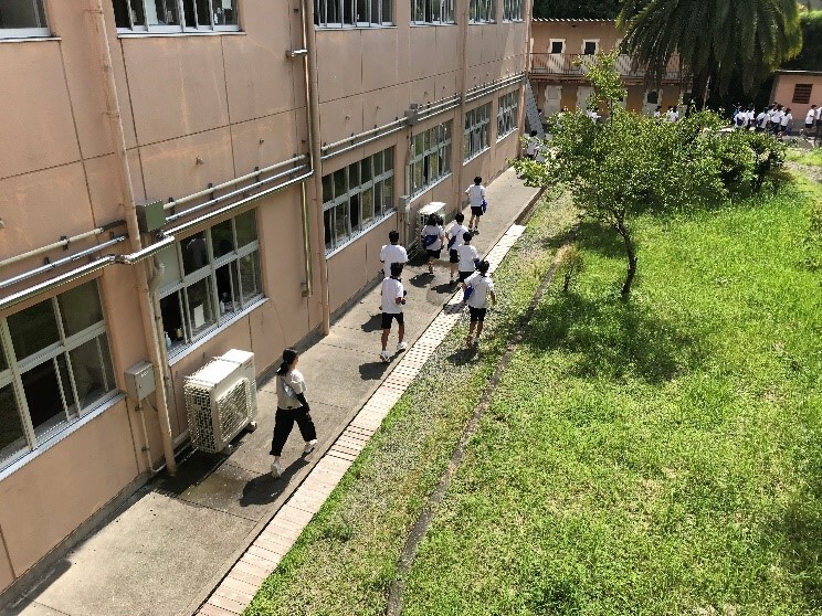 7月7日(金)午後、全校避難訓練を実施しました。今回の訓練は、大地震発生後に大津波が来ることを想定して、エディオンの上にある第3次避難場所まで避難するというものでした。訓練には警察官にも協力を要請し、国道の横断歩道を安全に渡ることができるよう警備していただきました。 教室から避難開始してから、避難場所まで避難して点呼が完了するまで、途中信号待ちをした時間も含めて約9分と、スムーズに非難することができました。今後も、毎月訓練を実施していく予定です。