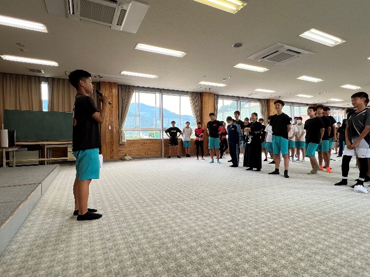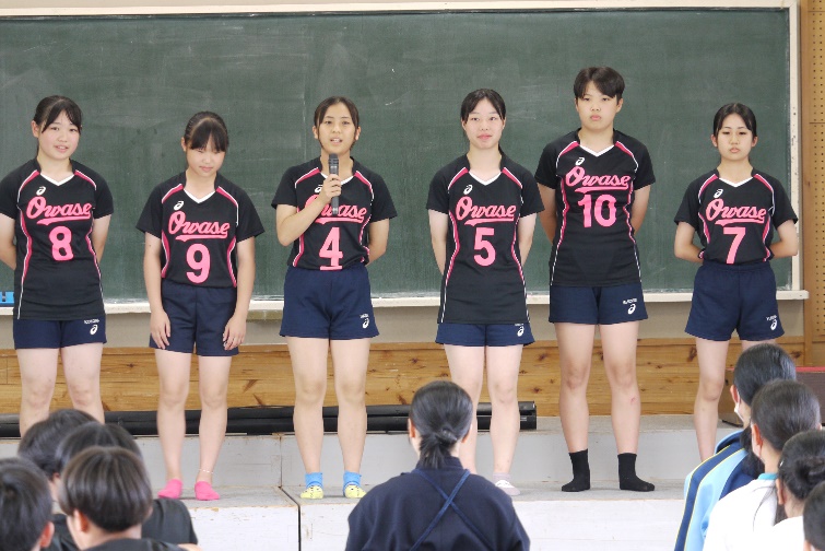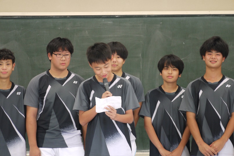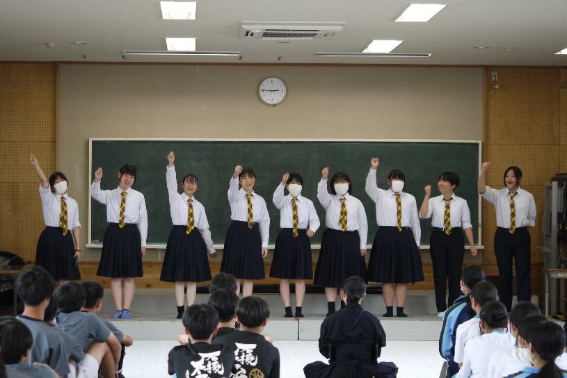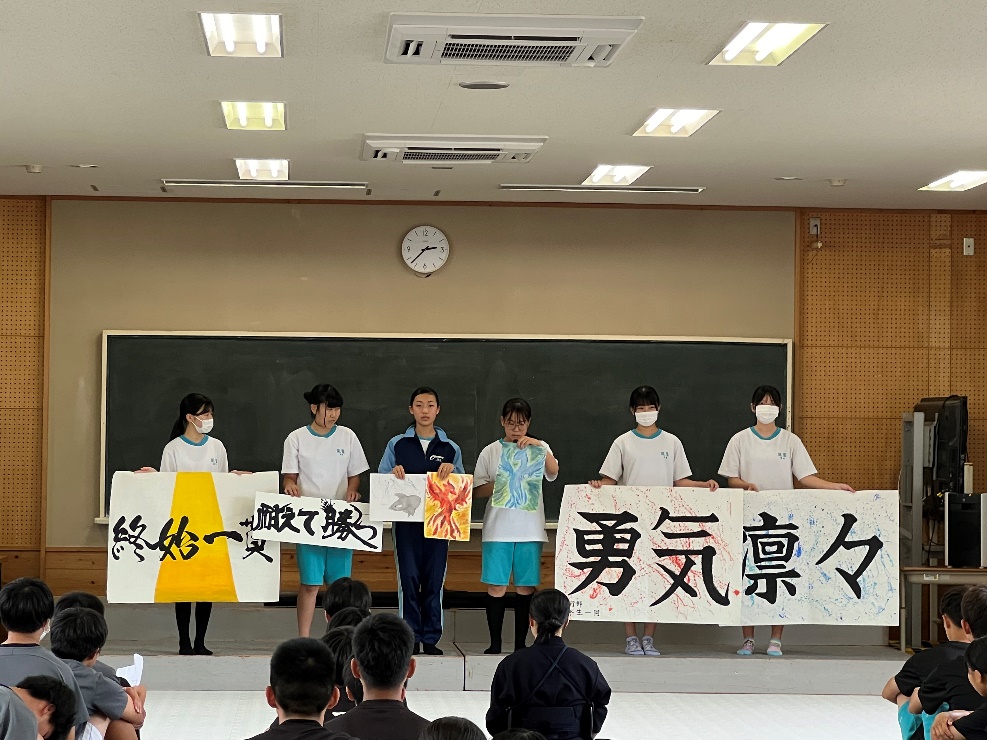 7月4日(木)郡市中体連夏季大会を目前に控えて壮行会を行いました。熱中症予防のため3年生のみ多目的ホールで行い、1・2年生はオンラインでその様子を見ました。どのクラブも最後の大会にかける意気込みや今まで支えてもらったまわりの人への感謝を述べ、大会で全力を出すことを誓っていました。最後は3年生全員で円陣を組み、大会へ向けて心を一つにすることができました。