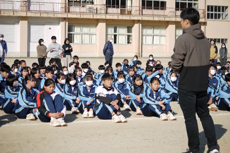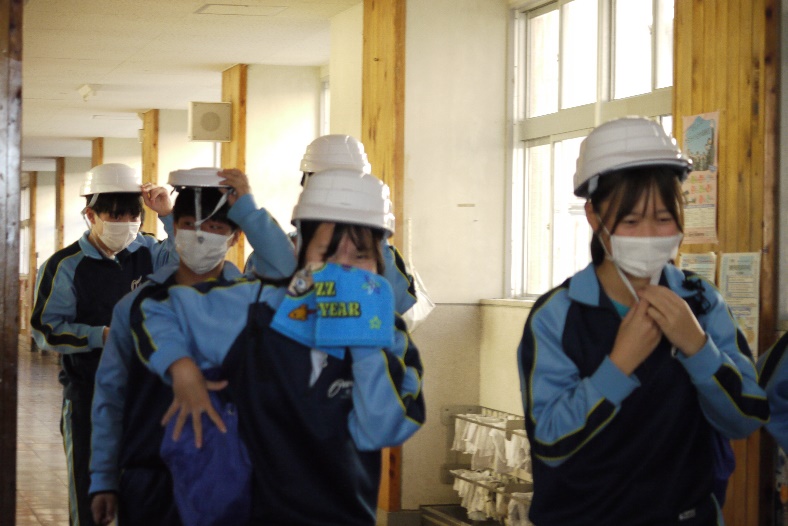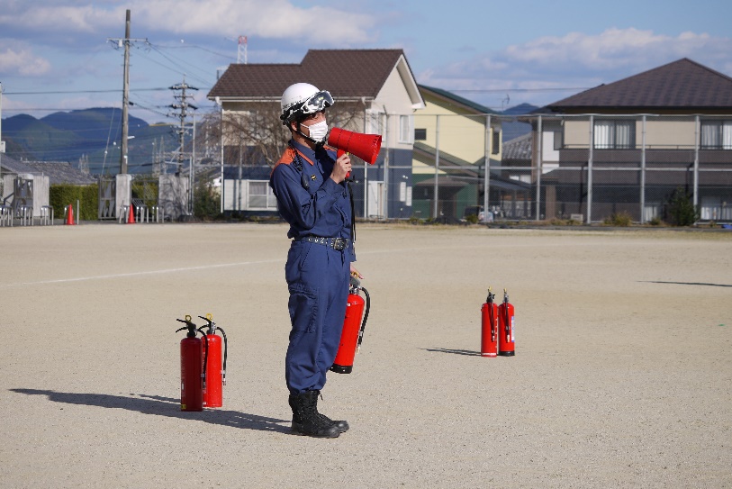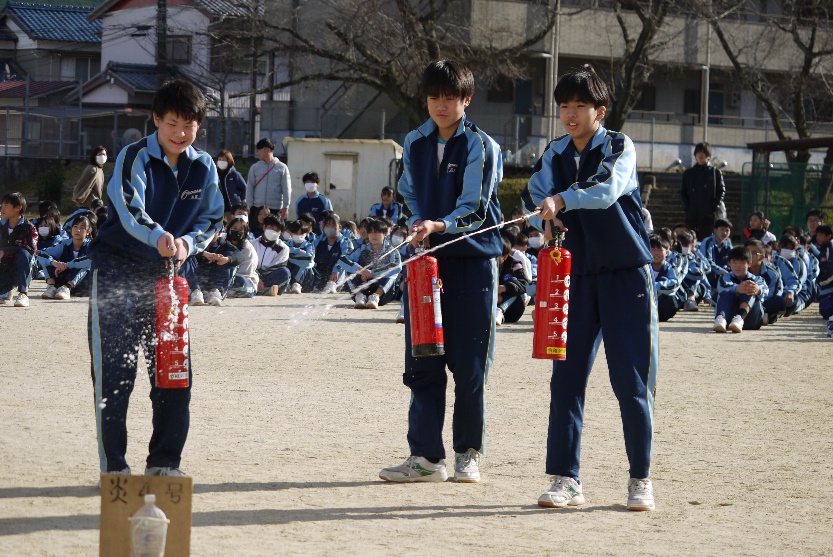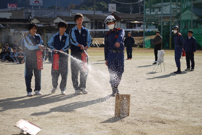 【避難訓練】12月17日(火)、火災による避難訓練を行いました。調理室で火災が起こったことを想定し、避難の放送・尾鷲消防署への通報・避難場所(グラウンド)への避難を行いました。避難後は、消防署の方から講話があり、また消火器を使っての初期消火の訓練も体験しました。
