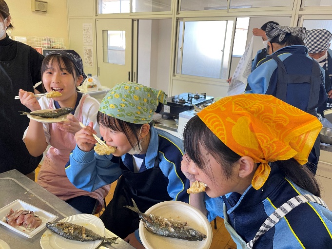 始めに尾鷲水産加工組合の北村豪組合長から三枚おろしの作業を実演していただき、生徒たちもアジの三枚おろしに挑戦しました。魚を調理するのが初めての生徒もいましたが、戦苦闘しながらも真剣に楽しく取り組みました。なかには刺身づくりに挑戦した生徒もいました。最後は、自分でさばいたアジを塩焼きやフライにして美味しくいただきました。
