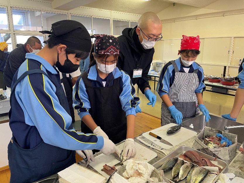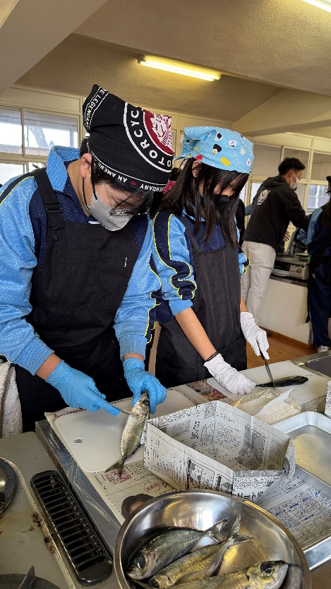 6月の3年生に引き続き、1月20日(月)21日(火)23日(木)の3日間、1年生が水産加工実習としてアジのさばき体験とアジを使った調理に取り組みました。