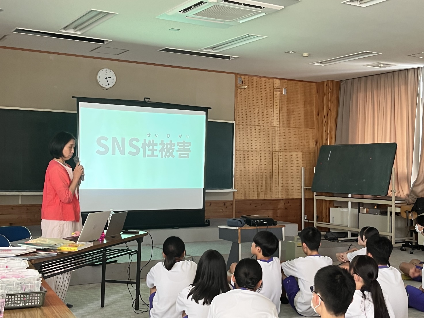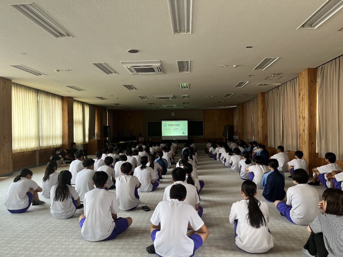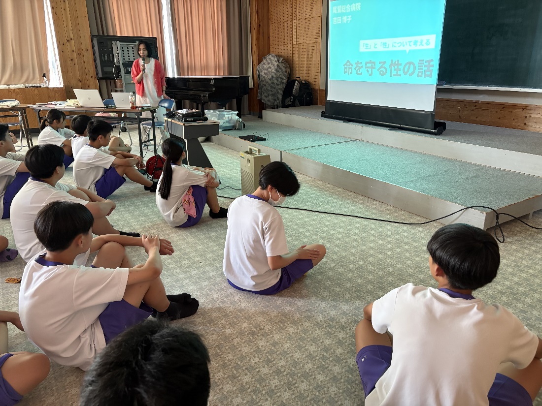 7月3日(木)に尾鷲総合病院で助産師として働いている吉田博子さんと尾鷲市社会福祉課の山本理江さんに来ていただき思春期教室を行いました。吉田さんからおとなの身体になりつつある中学校3年生のみんなに対して、男性・女性の身体のこと、赤ちゃんがどう生まれてくるのか、自分の身体をどのようにして大切に守っていくのかなどの話を聞き、今の自分を見つめたり、将来のことを考え学ぶことができました。話を聞いた生徒からは「赤ちゃんを産むことが簡単ではないことが分かりました。親にもっと感謝したいです。」「一番印象に残ったのはSNSの使い方でもっと気をつけようと思いました。」などの感想を聞きました。
