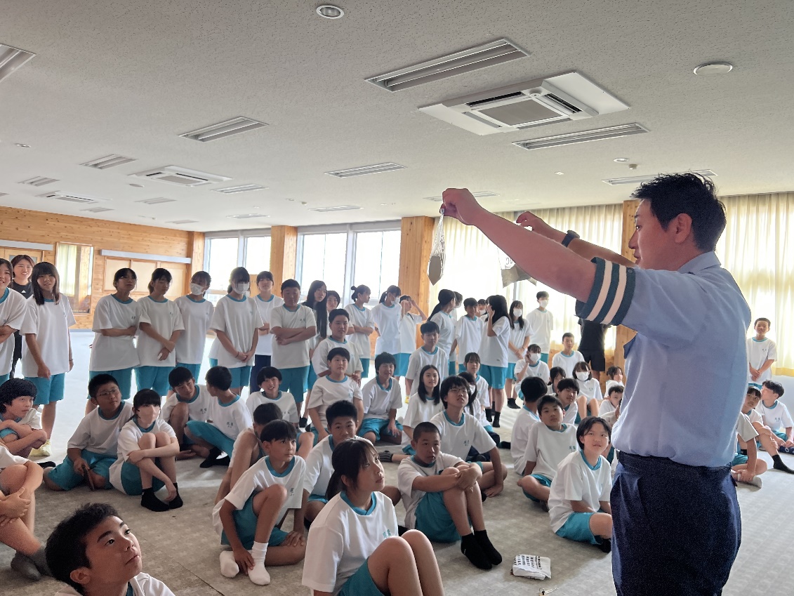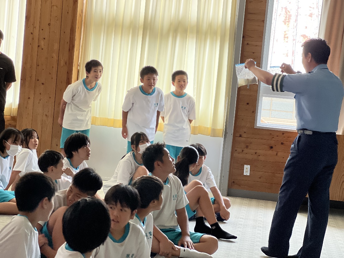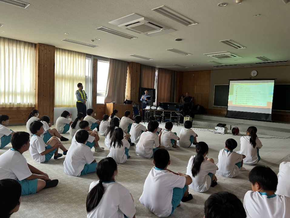 7月7日(月)~9日(水)の三日間、尾鷲警察署の生活安全課と交通課の方に来ていただき学年別で講話をしていただきました。初日の7日(月)は、1年生がSNSの使い方や自転車の乗り方(ヘルメットの着用)について講義を受け、インターネットトラブルの危険性やスマートフォンの安全な利用方法、自転車に乗る場合のヘルメット着用の大切さを学びました。
