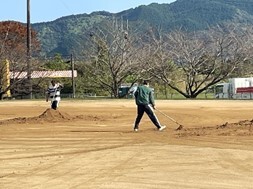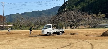 大型ダンプに3車分の土が入りました。小分けにして撒いてもらいました。あとは、先生方に手作業でならしてもらいましたが、もうたいへん。なんとか、ふかふかのグラウンドになりました。ちょっと事情があって、このあと業者に整地してもらう予定です。
