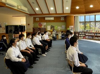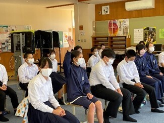 11月25日(金)、尾鷲高校を卒業後、三木浦町の『長久丸』に就職し、カツオ漁船に乗り、働いている野中歩夢さんを講師に迎えて、進路講話を行いました。野中さんは小さい頃から、海に関わる仕事に就きたいという思いを持っていたそうです。漁師になると決め、困難なこともあったけど、その思いを貫いたということでした。中学生に向けて、「自分の将来について好きなことややりたいことを考えて、何をしたら良いかをしっかり考え、自分から行動してほしい」というメッセージをいただきました。