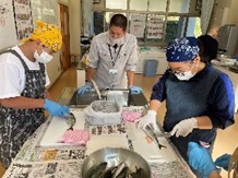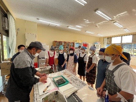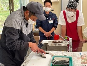 11月21日(月)市の「水産物普及啓発事業」による、お魚の調理体験を実施しました。講師を務めていただいた、北村商店の北村豪さんに魚(メアジ)のさばき方を教わりました。今回は1年生が実習しました。3尾目くらいからは、手慣れた感じが出てきて、おろし方も上手くなってきた?ようでした。とても良い学習になりました。関係者のみなさんありがとうございました。12月には3年生が実習する予定です。