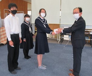 12日の文化発表会で保護者のみなさん、学校運営協議会のみなさんの善意で募金にご協力をいただきました。17日(木)に、集まった共同募金を生徒会本部役員から尾鷲市社会福祉協議会に寄付させていただきました。
