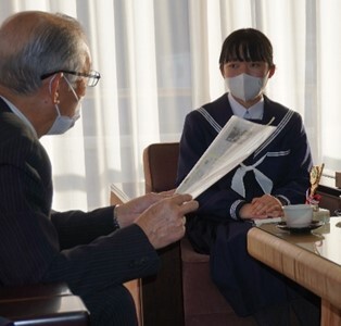 市長から藤井さんに対して、お褒めの言葉や全国大会への激励の言葉をいただきました。懇談の途中、実演をお願いしたいとの突然のリクエストがありましたが、落ち着いて堂々と応えていました。
