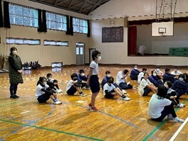 体育では、中学生と一緒にバスケットボールに挑戦しました。賀田小学校の6年生は、とっても元気。