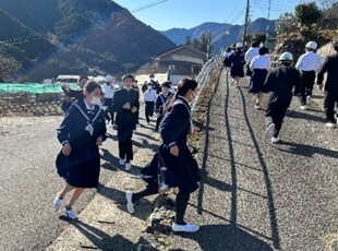 いつものように、避難経路を走っていきますが、途中で「ここはがけ崩れで通れません。」と先生が止めます。どうするかな?と見守る中、折り返した先頭の子どもが、「こっちは通れない、そっちのから行って!」と叫びます。それを聞いた子どもたちは、次々に伝えながら走ります。
