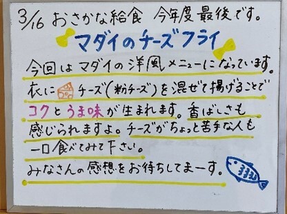「お魚給食」も残すところ、あと1回(3月16日)となりました。