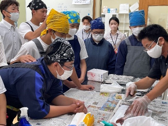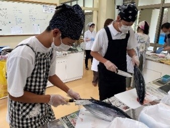尾鷲の養殖漁業について講義を受けたあと、三木浦で養殖された「真鯛」を調理しました。