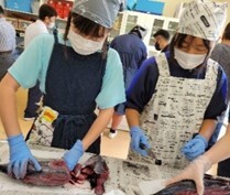 講義のあとは、市教委の高田さんからカツオのさばき方を教えていただきました。2年生の学習に引き続き、今回も市役所から大勢来てくださいました。