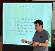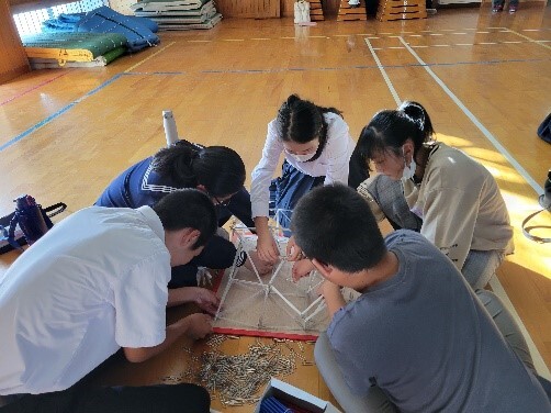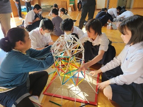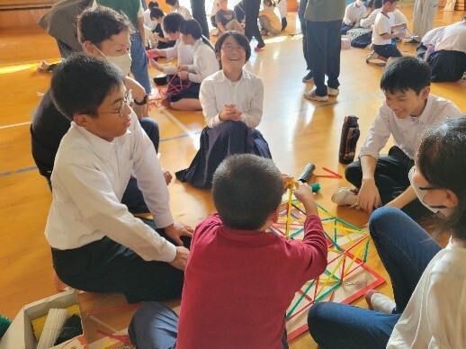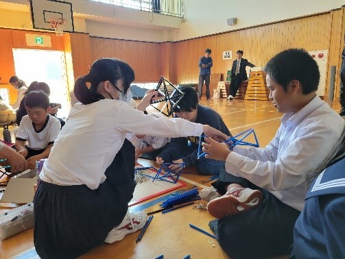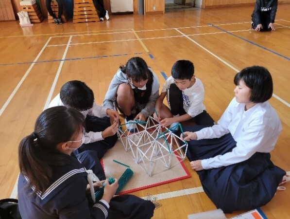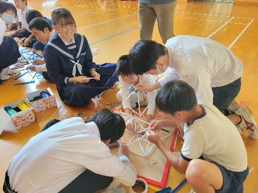 賀田小学校5,6年生の児童と中学生が7つのグループに分かれ、「地震に強い家」をデザインし、ストローを使って実際に組み立てていく『ストロー・ハウス』にチャレンジしました。「筋交い」を入れて、三角形を作ることで強くなる!? どこに、どちら向きに・・・みんな熱中します!『ああだこうだ』言いながら取り組みました。川口先生もおっしゃっていましたが、「数学・物理学・工学・地学・芸術・技術科・家庭科・・・」様々な学問の要素がつまっています。防災を学びながら、いろんな学びにつなげていってほしいなあとも思いました。図らずも、高度な技術を取り入れている「家」になったグループもあったり。