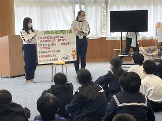 その後交通安全教室が実施され、自転車の交通ルールや交通事故の危険性などを学びました。子どもたちは真剣な眼差しで映像や説明を聞き、交通ルールを守ることが自分の命を守り、相手も守ることにつながることを実感しました。
