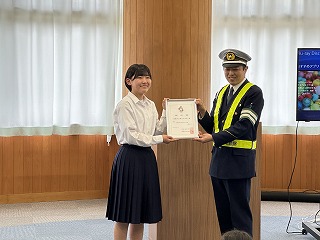 4月11日(木) 尾鷲署交通安全課と尾鷲地区交通安全協会より、本年度の自転車安全教育モデル校の指定を受けました。最初に認定式が行われ、生徒会長の下地ももさんが、交通安全課課長と交通安全協会会長から指定書を受け取りました。