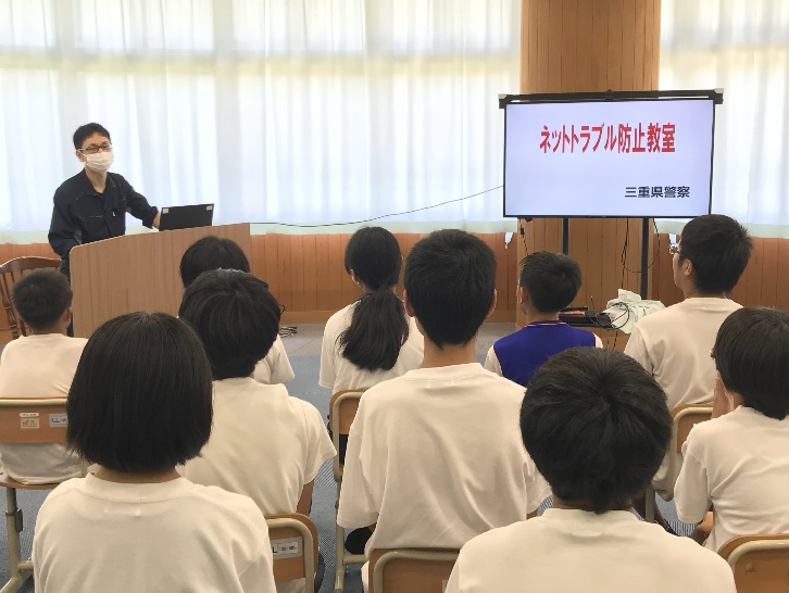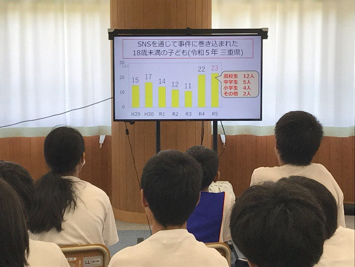 7月18日(木)、尾鷲警察署生活安全課の方を招いて、「ネットトラブル防止教室」を開催しました。