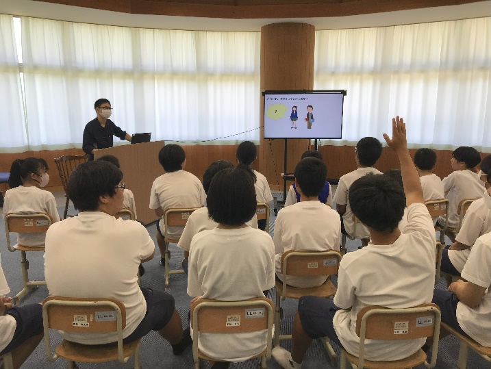 一度ネット上にアップした動画や画像などの情報は回収や削除が困難であることや、自分が気づかないうちに騙されて被害者になるだけでなく、加害者にもなる可能性があることなど、ネットの危険性について説明していただきました。そして、そのような危険から自分や友だちを守るにはどうすればいいかということを、クイズを交えながら教えていただきました。