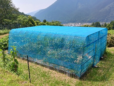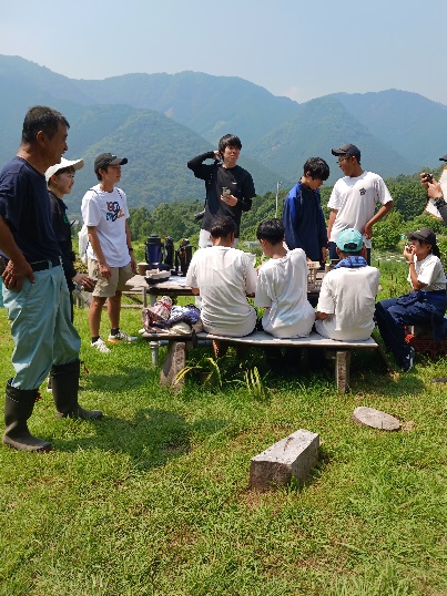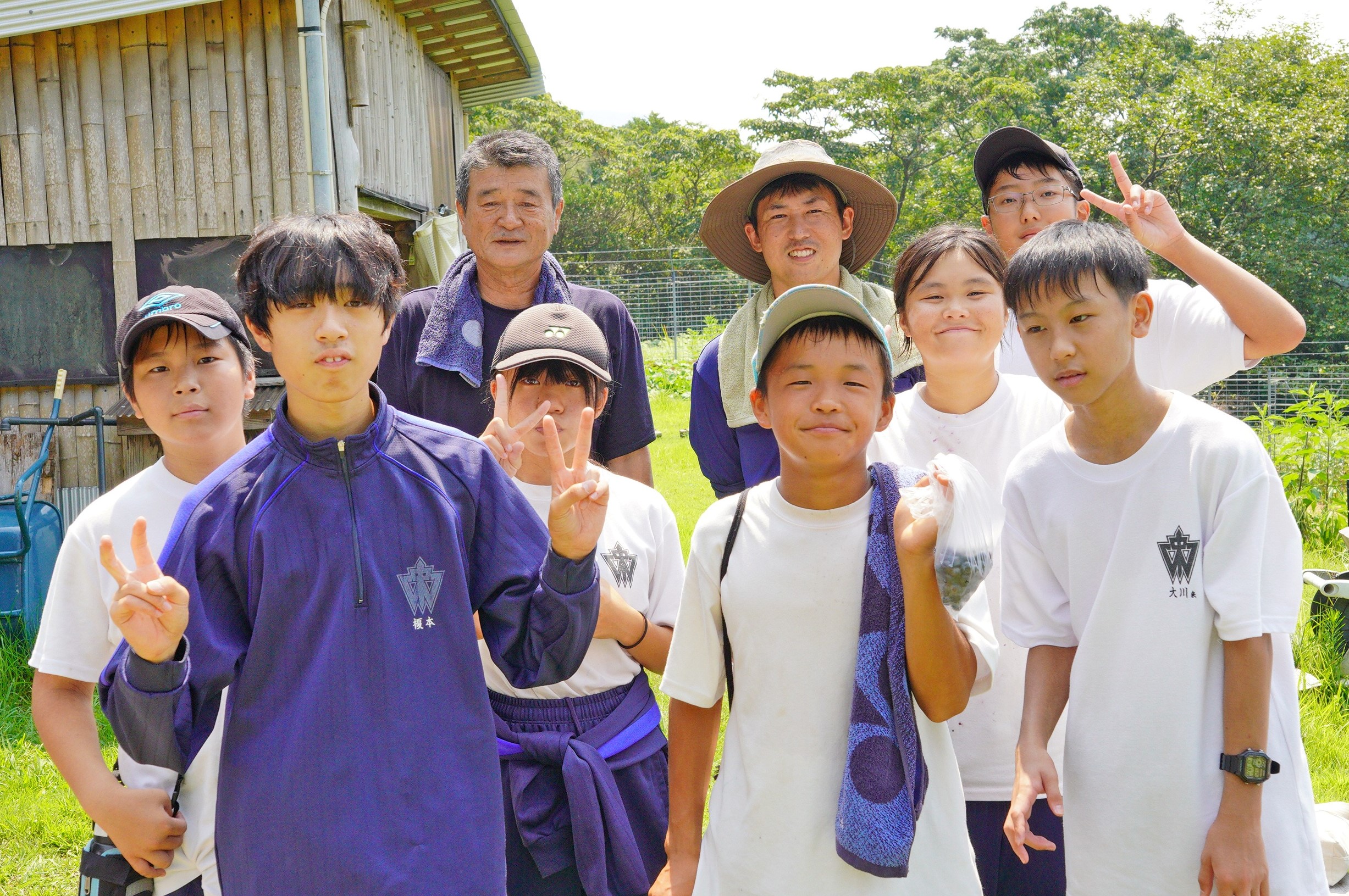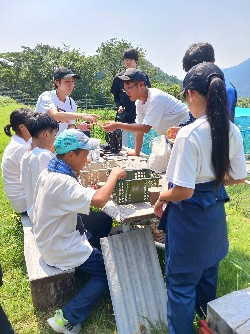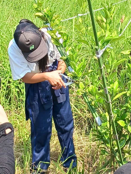 [輪内中学校 ふるさとキャリア教育] 8月4日(月)輪内中学校2年生が農業体験で三木里町の農地の見学と収穫体験をしました。ふるさとキャリア教育では、2年生で尾鷲の有機農業について1年間を通して学びます。まず初めにShoji紀Farmの庄司さんが有機農業で育てているスイートスプリングというみかんの幼木を育てるために取り入れているDOHOスタイル(立上剪定)について学び、剪定作業も体験することができました。次は村上さんの園地に移動してブルーベリーを収穫しました。自分たちが収穫した大粒のブルーベリーや村上さん手作りのブルーベリージャム、庄司さんが育てた梅を使用した梅ジュースを堪能し、「おいしい!こんなに甘いのー!!」と驚くばかりでした。収穫体験の後、全員で集合写真を撮影し、とても良い時間を過ごしました。